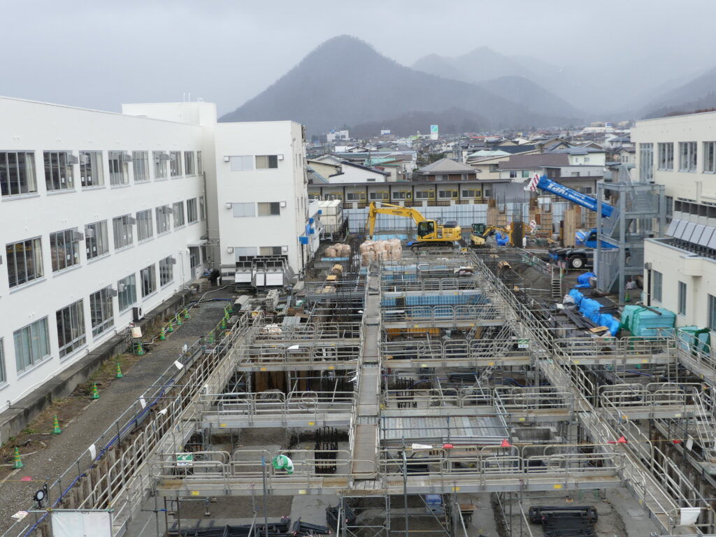 新1号館建築及び3号館耐震改修工事が進んでいます。新校舎建築の基礎工事が行われ、少しずつ高くなってきています。左側の現3号館の外装工事は終え、教室の工事が進んでいます。新1号館は、右側に見える現在の管理棟と左側の現3号館の間に、現6号館につながるL字型に建築されます。生徒の皆さんには不便ななかご協力をいただいています。