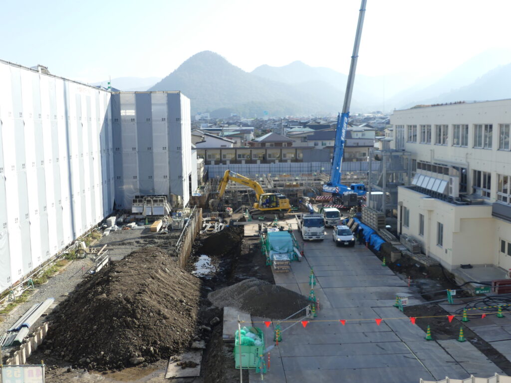 新1号館建築及び3号館耐震改修工事が進んでいます。新校舎建築の整地がほぼ終わり、写真奥には新校舎の骨組みが始まりました。左側のシートに覆われた校舎が現3号館になります。新1号館は右側奥から現6号館につながるL字型に建築されます。生徒の皆さんには不便ななかご協力をいただいています。