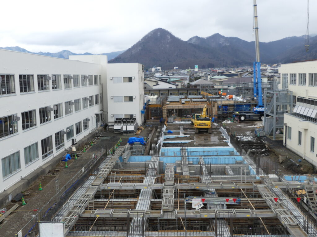 新1号館建築及び現3号館耐震改修工事が進んでいます。新1号館は、左側の現3号館と右側の管理棟の間に、管理棟奥の現6号館につながるL字型に建築されます。写真奥に、現3号館と現6号館へつながる校舎の骨組みが高くなってきた様子が見られます。生徒の皆さんには不便ななかご協力をいただいています。
