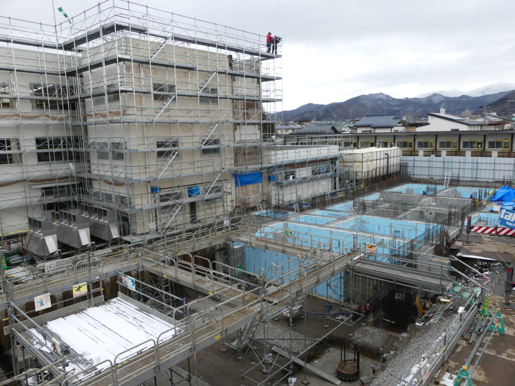 新1号館建築及び3号館耐震改修工事が進んでいます。新校舎建築の基礎工事が行われています。左側の現3号館を覆っていたシートが外され外装工事も終え、教室の工事が進んでいます。新1号館は、現在の管理棟と現3号館の間に、現6号館につながるL字型に建築されます。生徒の皆さんには不便ななかご協力をいただいています。