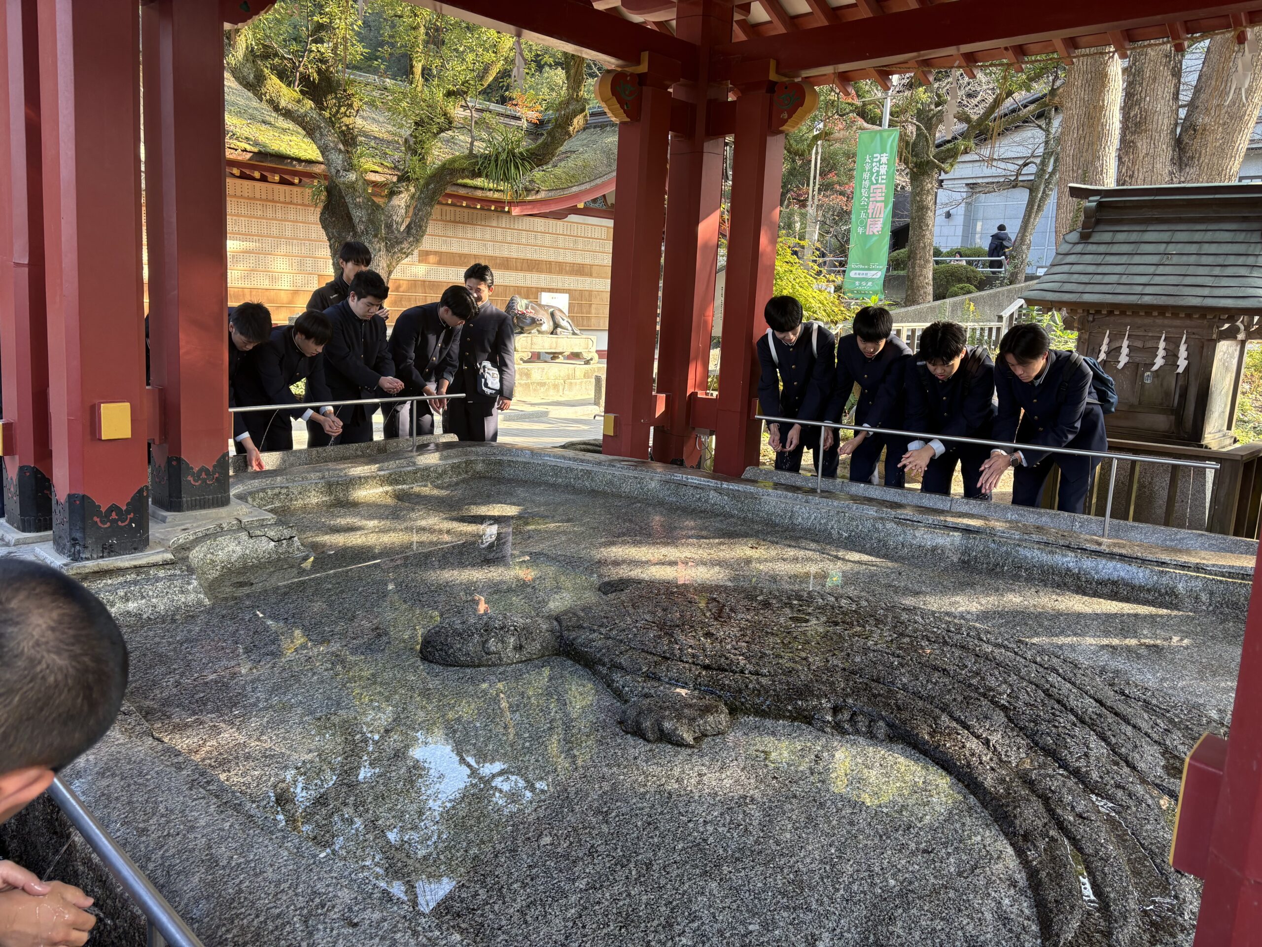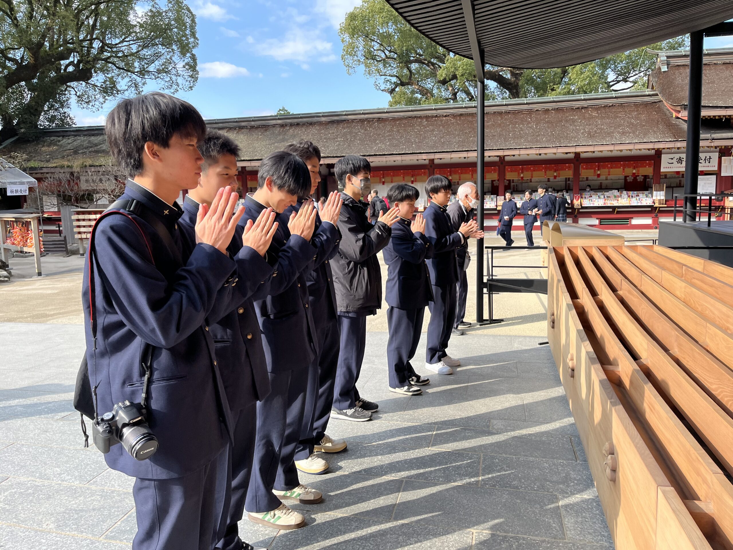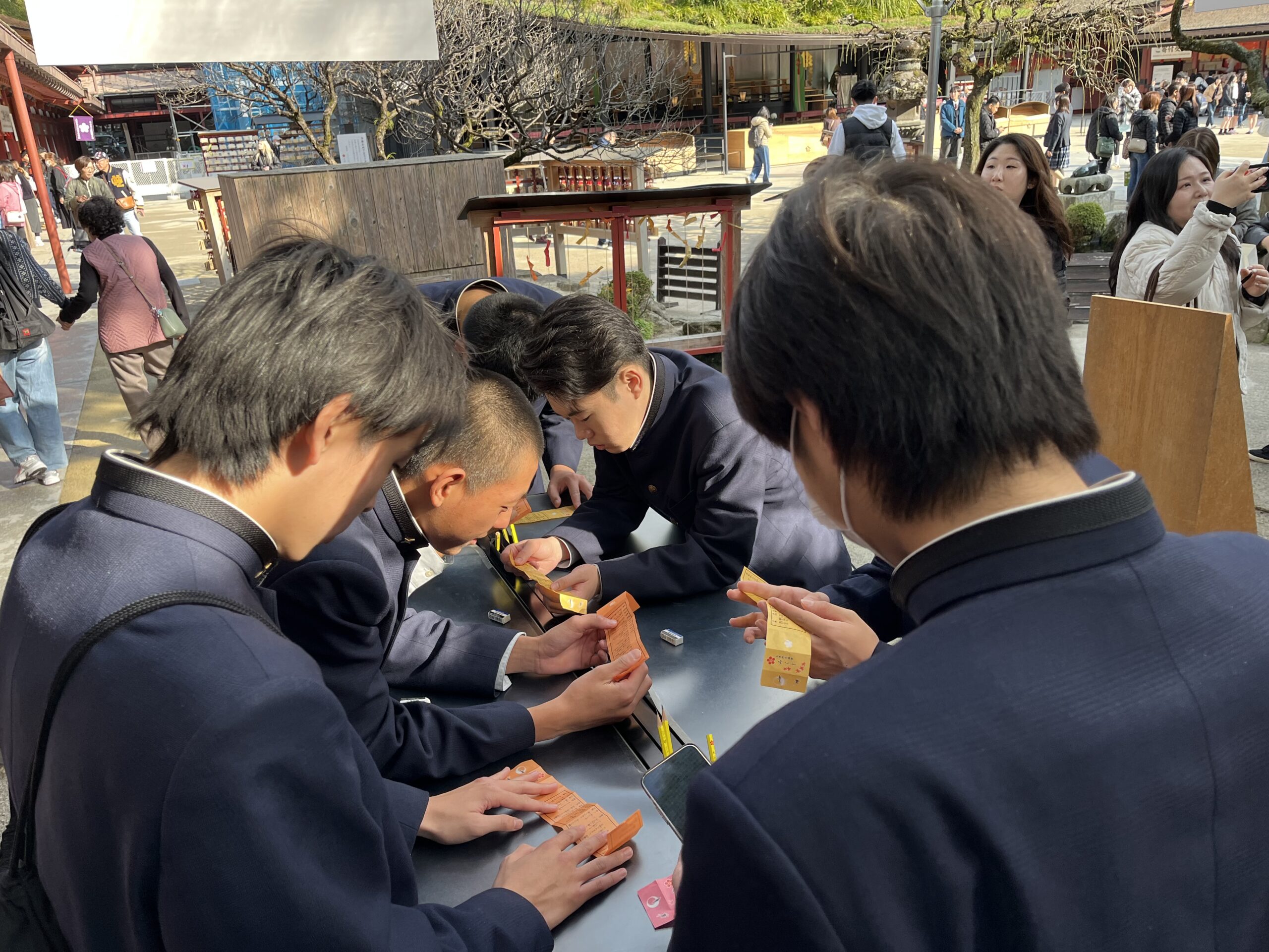 午前中は太宰府天満宮を参拝しました。境内に足を踏み入れると、歴史の重みを静かにまとった建造物が立ち並び、澄んだ空気や豊かな緑が、旅の疲れをそっと包み込むように感じられました。生徒たちはそれぞれのペースで参道を歩き、学業成就やこれからの成長への願いを胸に、穏やかな気持ちで手を合わせていました。その姿はとても落ち着いていて、これまでの旅の経験が生徒たちの中で確かに実を結びつつあるように思えました。参拝後には、太宰府名物の梅ヶ枝餅を楽しむ姿も多く見られました。あたたかい餅を手にしながら友達と笑顔を交わす時間は、修学旅行の最後を飾る、心温まるひとときとなりました。美しい景色と静かな空気、そしておいしい味が合わさり、生徒たちにとってやさしい記憶として心に残ったことでしょう。