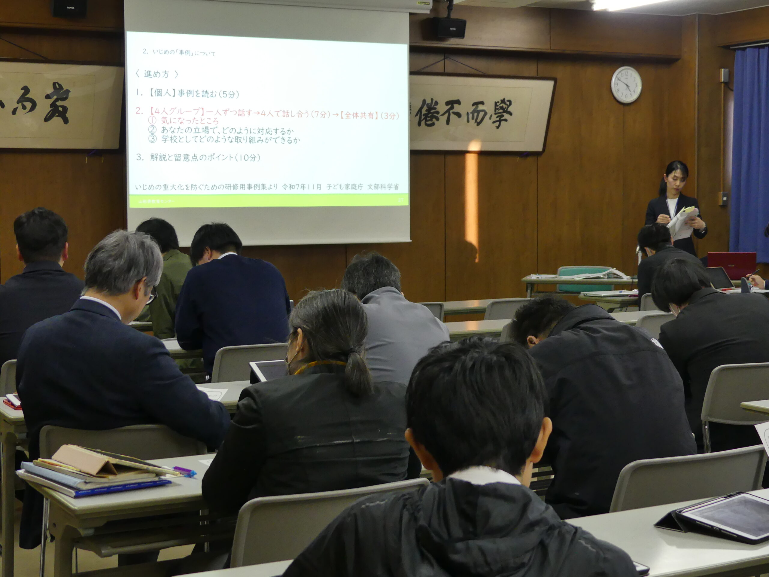 2月17日(火)に「教職員研修会」を開催しました。 ⼭形県教育センター研究・教育相談課の門脇史恵先生を講師に迎え、「いじめ防止対策と事例について」をテーマに研修を行いました。 研修内容を踏まえ、生徒一人ひとりが安心して学校生活を送ることができる環境づくりに、教職員一丸となって努めてまいります。